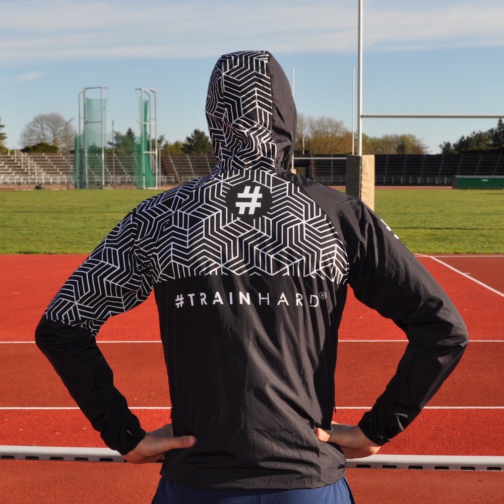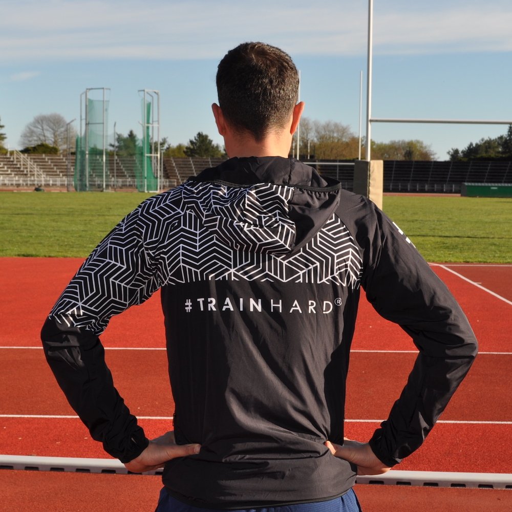 Veste coupe-vent #trainhard, à capuche, tissu déperlant, à séchage rapide. Idéal pour la pratique du running, ou des sports en plein air.